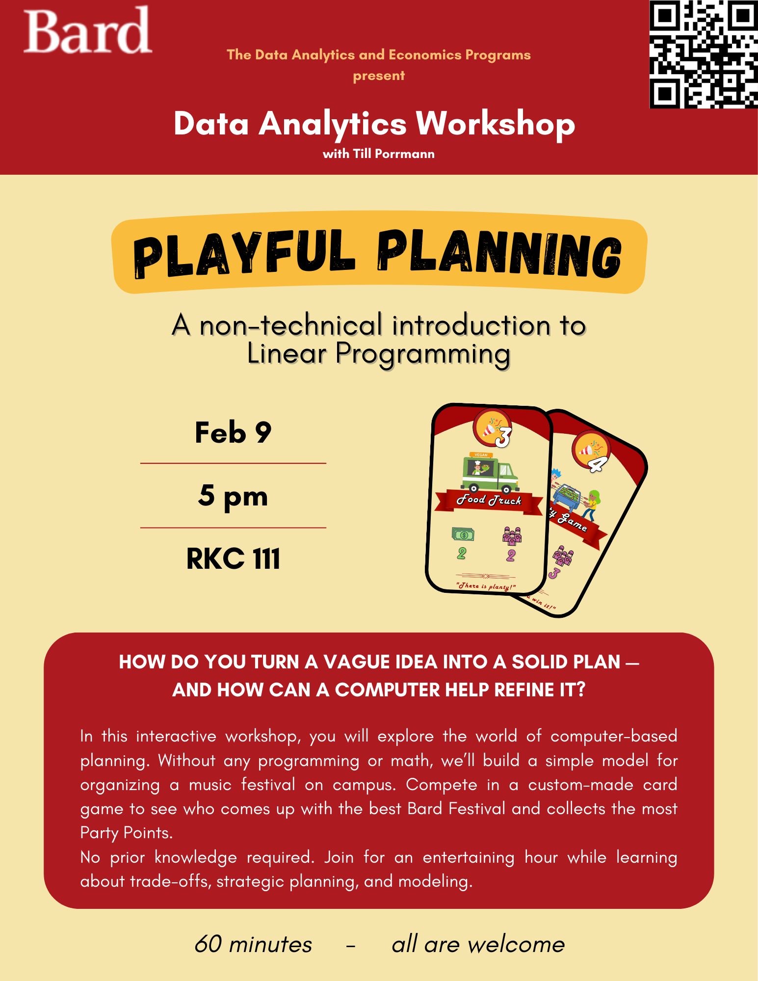 In this interactive workshop, you will explore the world of computer-based planning. Without any programming or math, we'll build a simple model for organizing a music festival on campus. Compete in a custom-made card game to see who comes up with the best Bard Festival and collects the most Party Points. No prior knowledge required. Join for an entertaining hour while learning about trade-offs, strategic planning, and modeling.